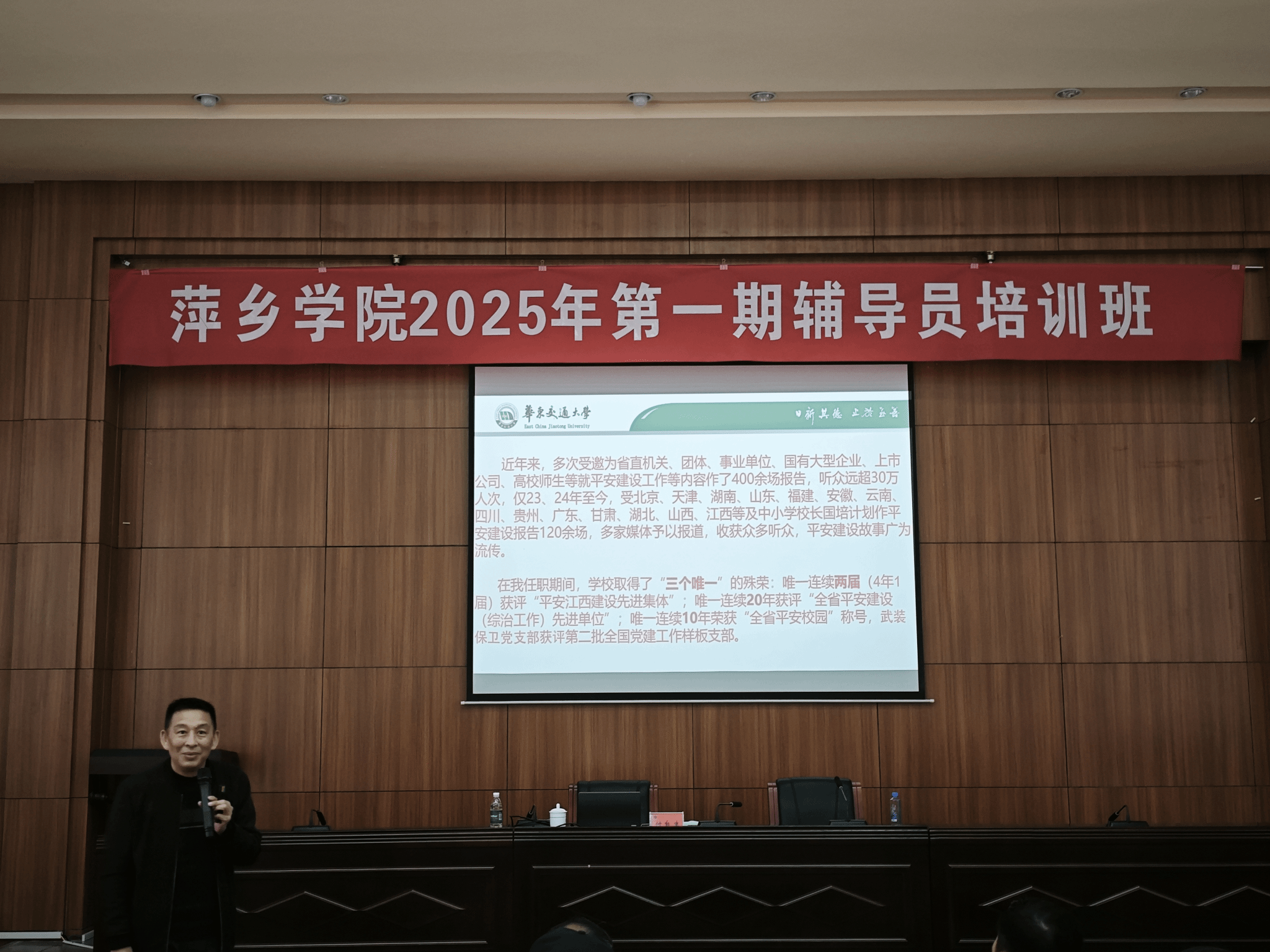 为切实提高辅导员安全管理能力,精心构筑安全和谐的校园环境,全力护航学生的人身安全与健康成长,2月27日至28日期间,beat365官网在至善楼学术报告厅举办了2025年第一期辅导员培训班。此次培训特邀萍乡市委网信办综合科科长黄灿、原华东交通大学保卫处处长付自生、安源区公安分局女警工作室警官帅歌、李格等进行专题辅导,校党委委员、副校长陈永国出席会议并作开班式讲话。萍乡市公安局国保支队副支队长谢强、江西工业工程职业技术学院保卫处副处长刘杨彬、江西应用工程职业学院保卫处处长吴一峰、萍乡卫生职业学院保卫处处长黄林应邀出席开班式。学工处负责人、各二级学院党委副书记、学工科长、全校专兼职辅导员、学生工作处相关同志、网评员以及部分学生代表参加培训。