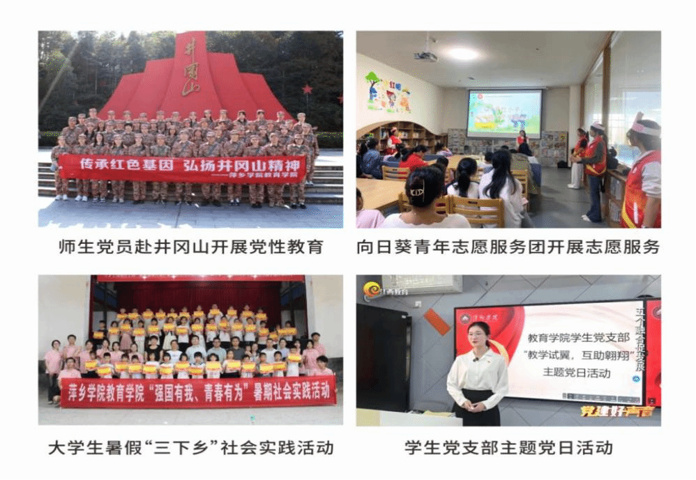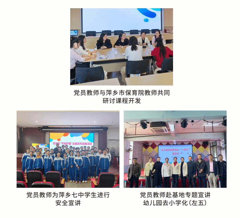 高层次人才服务团的党员教师主动为乡村振兴贡献智慧与力量;安源区基础教育协同提质服务团成员定期为安源区中小学教研室举行专题讲座,赋能师生成长;湘东区学前教育协同提质服务团成员助力乡镇学前师资专业化成长;民间艺术工作室成员深入社区和学校,大力传承剪纸等传统文化;“向日葵”青年志愿服务团社会实践活动赋能农村教育事业发展;“11734”党员模式激励党支部成员担当作为……