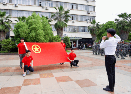 国旗护卫队队员擎着鲜艳的五星红旗,迈着铿锵有力的步伐入场。伴着激昂的《义勇军进行曲》,五星红旗冉冉升起,全场师生齐声高唱国歌,行注目礼。