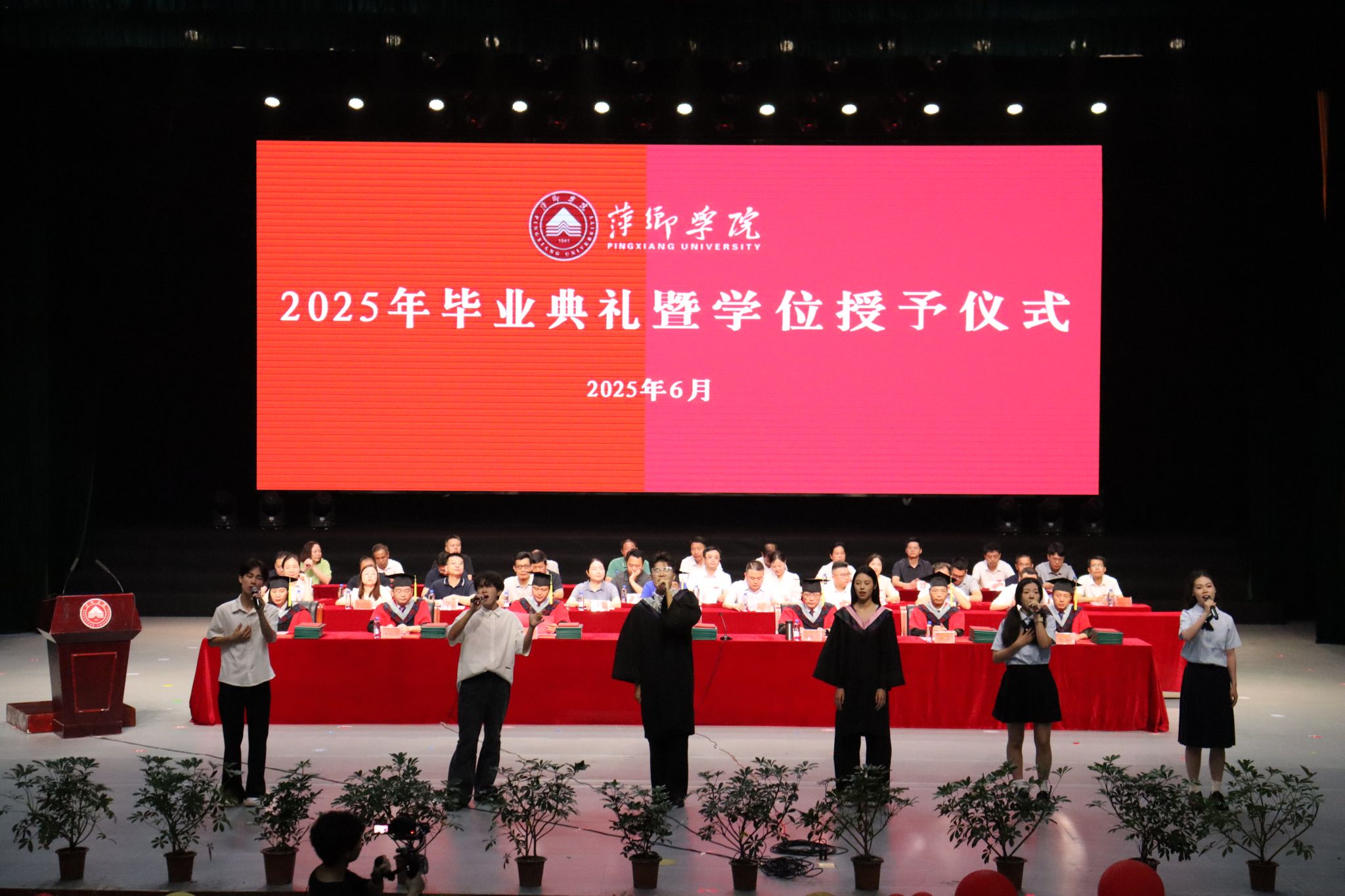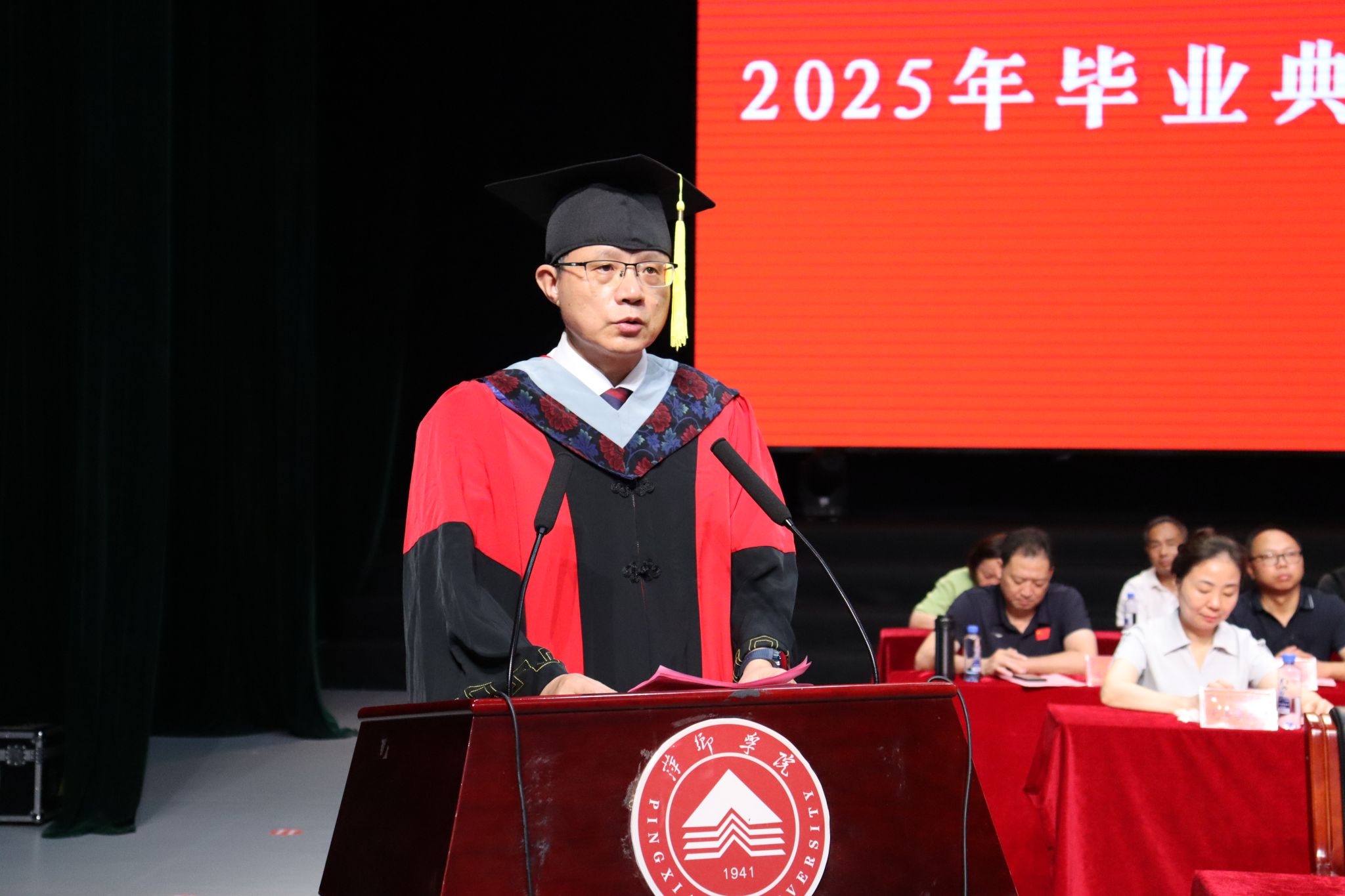 刘林芽代表学校,向2025届毕业生奋力拼搏圆满完成学业表示热烈的祝贺。他表示,这一纸毕业证书的背后是大家深耕专业的艰辛与收获,是充实人生的实践与历练,更是飞扬青春的定格与见证。从初入萍院时对知识的渴望,到今日即将离校时的自信从容,校园的每一处角落都镌刻着大家奋斗的足迹。这四年,大家不仅是学校跨越式发展的见证者,更是改革创新的参与者。