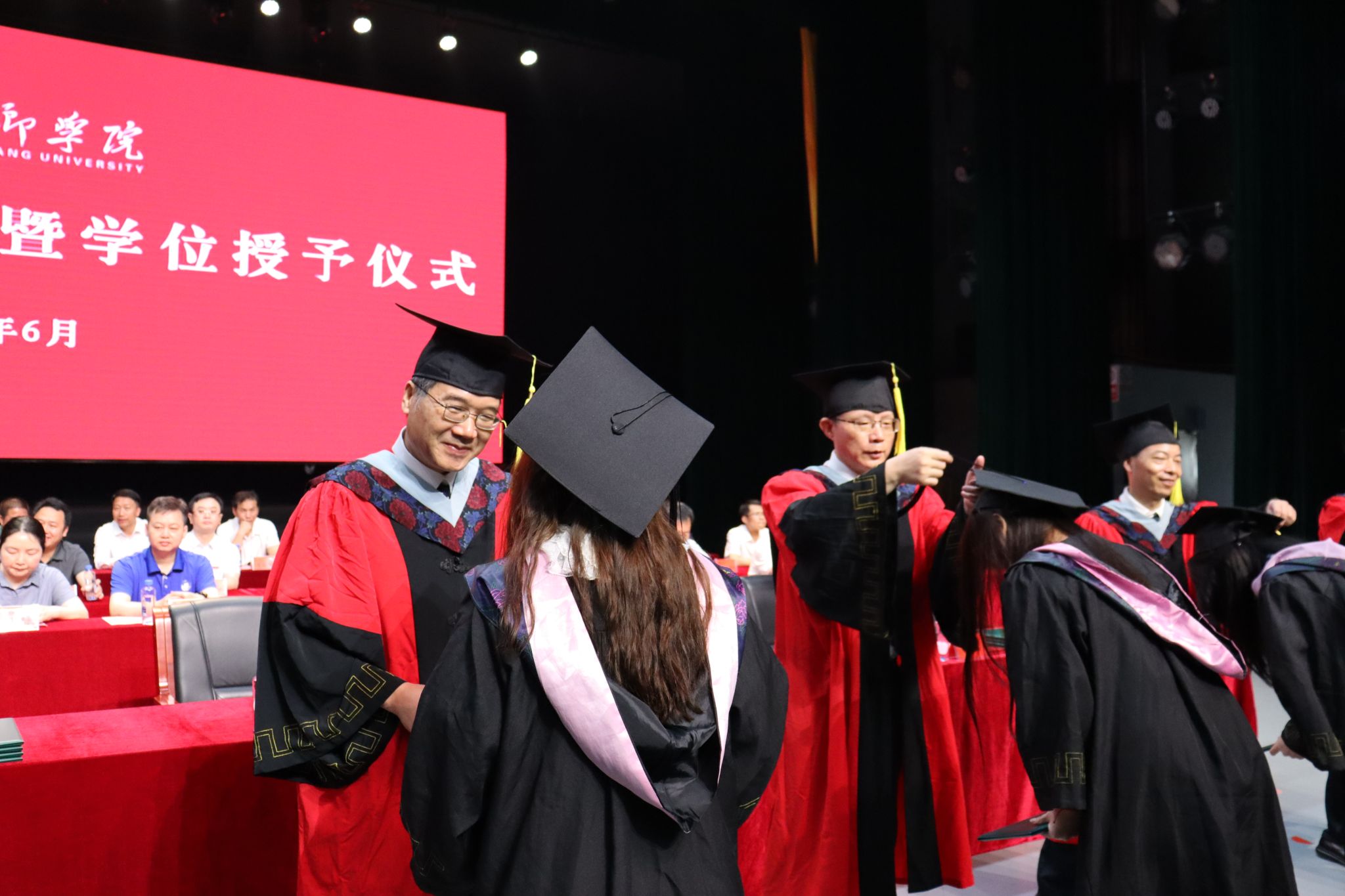 校领导为本科毕业生代表颁发学士学位证书并为代表扶正流苏。