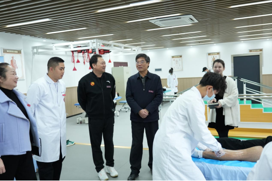 主题班会结束后,邱晓辉一行来到体育学院运动康复专业实训中心,沉浸式体验体育学院学生康复训练课。在曹建洋老师的专业讲解与示范下,邱晓辉详细了解了康复训练课程的教学目标、课程设计与实操要点,现场观摩了同学们的动作练习,并与授课教师、学生亲切交流,对学院将理论知识与实践技能深度融合的教学模式给予充分肯定。他指出,康复训练是体育专业的特色优势领域,要持续深化教学改革,强化实践教学环节,助力学生练就过硬专业本领,为未来职业发展筑牢根基。