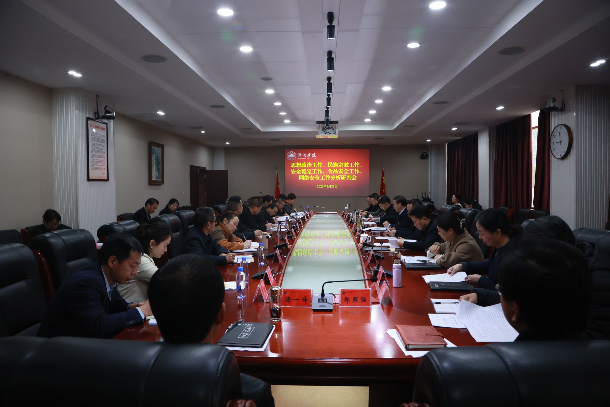 3月27日,beat365官网在至善楼第一会议室召开思想政治工作、民族宗教工作、安全稳定工作、食品安全工作、网络安全工作分析研判会。校领导陈永国、刘培圣、王林清、曾敏、贺晓梅出席会议。人事处、学工处、保卫处、后勤处、网络与教育技术中心等相关部门负责人以及二级学院党委书记参加会议。会议由党委副书记陈永国主持。