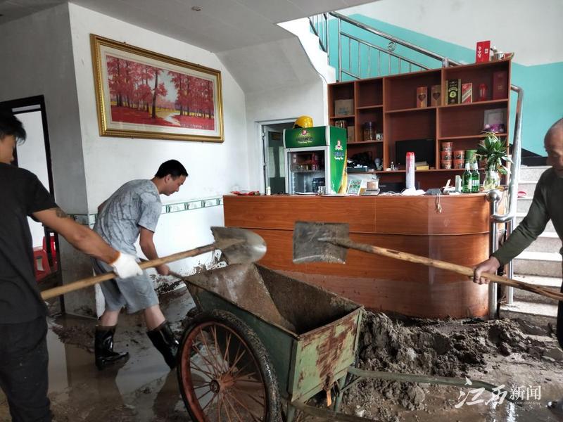 在驻村工作队的协助下,关山组32名村民被安全转移到村委会办公楼临时食宿。扶贫工作队组织村民清理河道和道路上的树枝杂物,以及家中的泥沙和垃圾,协调武功山麻田卫生院为灾区村民房内房外喷洒消毒药物。