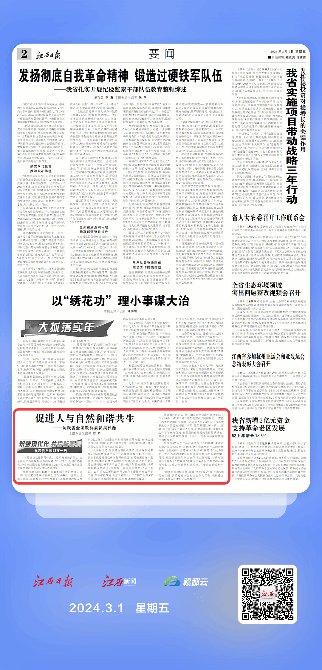 如何破解“生态产品产业链与产业网构建、文化赋能和产业能人培育”的难题,更好实现生态产品的价值转换,推进美丽中国建设与乡村振兴,这是吴代赦多年来一直在思考的课题,也是他今年重点准备的提案。同时,他还关注鄱阳湖生态环境治理问题,对碟形湖的科学管理和“堑秋湖”这种传统渔业生产方式的扬弃与传承、实现人与自然和谐共生,有着自己的分析与思考。