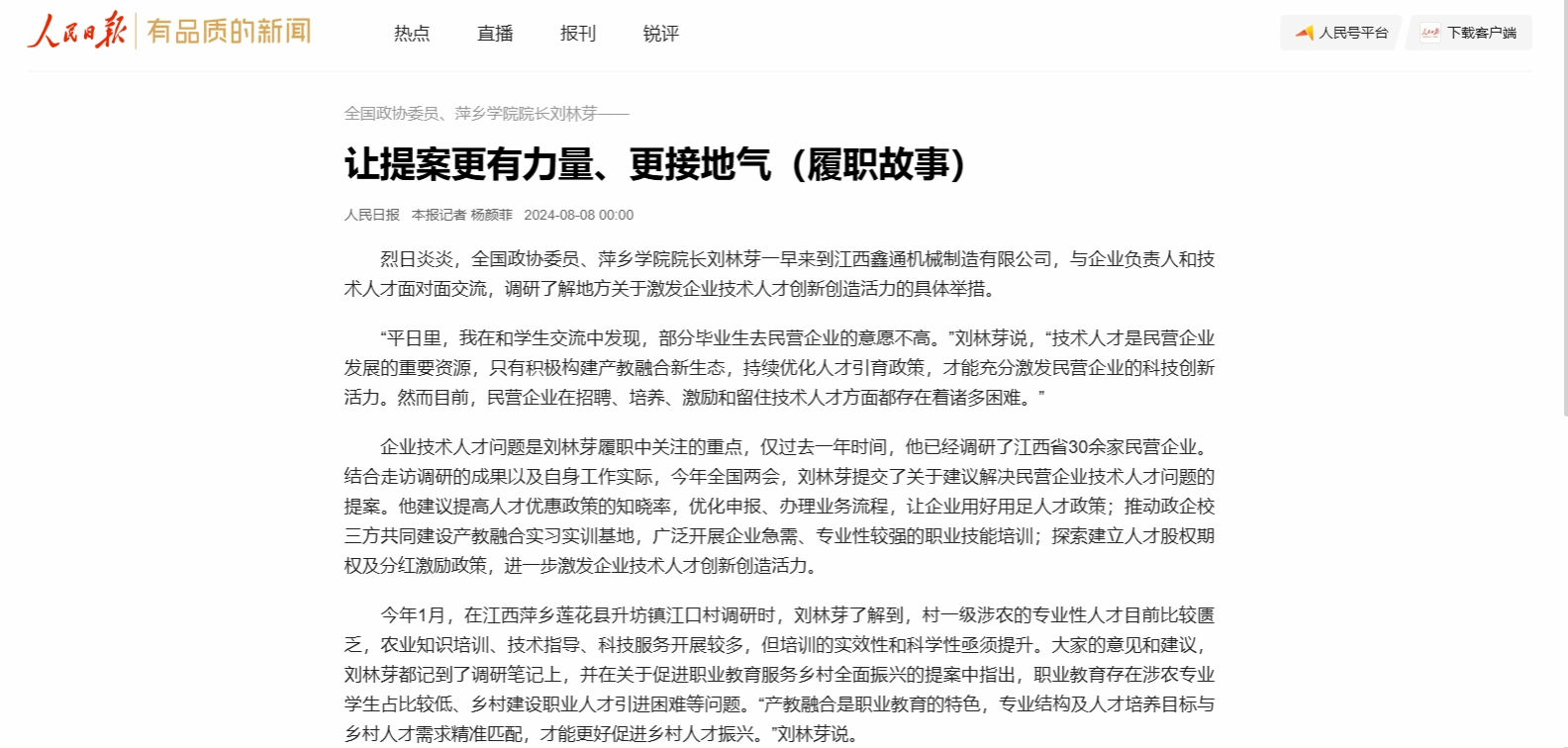 企业技术人才问题是刘林芽履职中关注的重点,仅过去一年时间,他已经调研了江西省30余家民营企业。结合走访调研的成果以及自身工作实际,今年全国两会,刘林芽提交了关于建议解决民营企业技术人才问题的提案。他建议提高人才优惠政策的知晓率,优化申报、办理业务流程,让企业用好用足人才政策;推动政企校三方共同建设产教融合实习实训基地,广泛开展企业急需、专业性较强的职业技能培训;探索建立人才股权期权及分红激励政策,进一步激发企业技术人才创新创造活力。