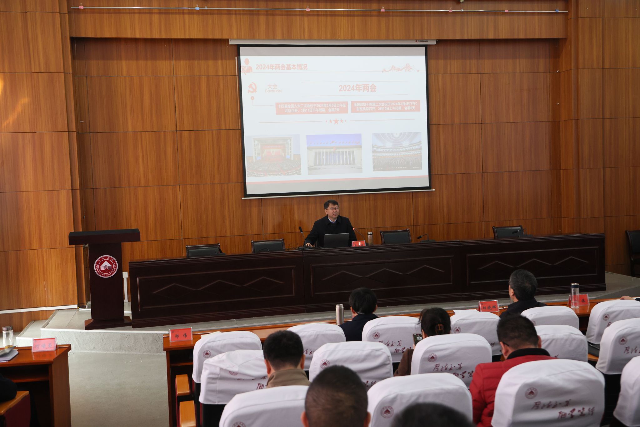 3月19日,全国政协委员、副校长吴代赦在至善楼报告厅专题宣讲2024年全国两会精神。全体在家校领导以及全校副处级以上领导干部聆听报告。报告会由校党委书记邱晓辉主持。