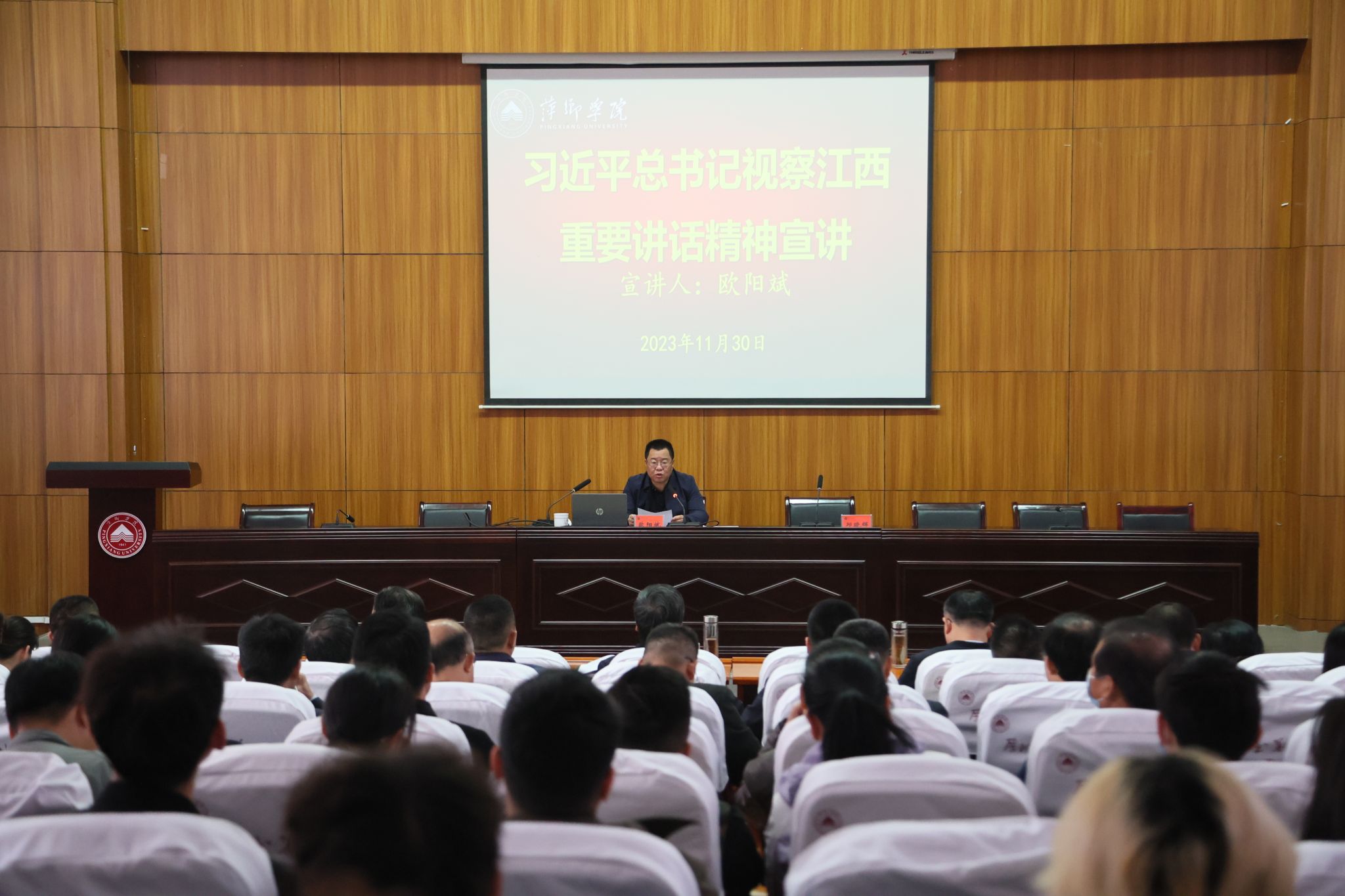 11月30日,萍乡市委宣讲团成员,市纪委副书记、市监察委员会副主任欧阳斌莅临学校宣讲习近平总书记考察江西重要讲话精神。全体校在家领导,各职能部门负责人,各二级学院党委书记、副书记,部分辅导员和学生代表约180人聆听报告。报告由校党委书记邱晓辉主持。