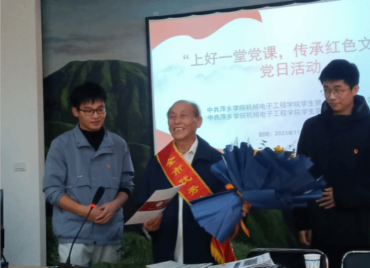 2023年11月14日下午,机械电子工程学院学生党支部在2200会议室开展“上好一堂党课,传承红色文化”党日活动。活动邀请到了“萍乡市最美离退休党支部书记”江福星同志来给全体党员上这一堂传承红色文化的党课。活动由支部书记占丽娜主持。