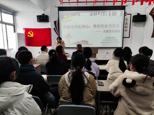 为进一步强化党员的身份意识、宗旨意识和责任意识,提升党员组织归属感和政治荣誉感,2023年12月12日中午12点15分,外国语学院学生党支部于18栋“红管家”一站式学生社区举行“政治生日忆初心,勇担使命当先行”主题党日活动。外国语学院党委书记刘佳萍,英语支部、商务英语支部全体党员参加此次活动,活动由学生英语党支部书记曹金萍主持。