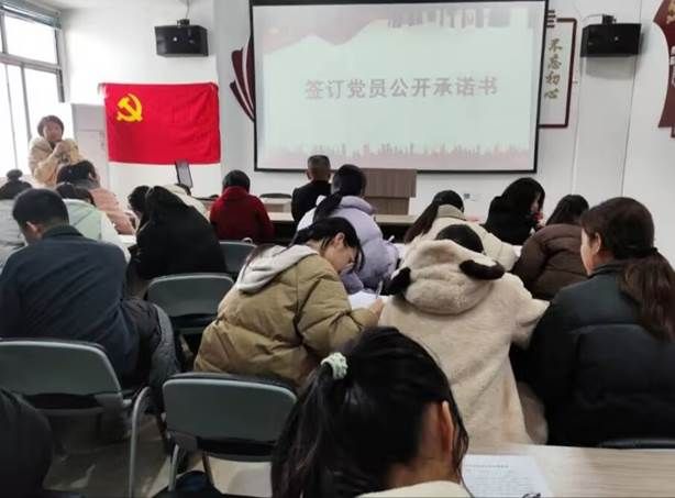 第七项议程,全体同志签订党员公开承诺书。第八项议程,全体起立,老师们为过“政治生日”的党员赠送生日礼物。