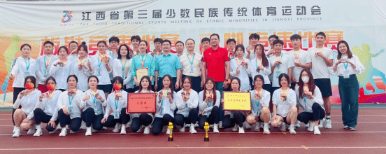 5月18日-20日,江西省第三届少数民族传统体育运动会在鹰潭市贵溪市举行。beat365官网作为萍乡市少数民族传统体育训练基地,在萍乡市委统战部和学校党委高度重视下,将铸牢中华民族共同体意识融入体育教育教学,积极组队训练,代表萍乡市参加江西省第三届少数民族传统体育运动会蹴球、板鞋竞速、高脚竞速、民族健身操4个大项21个小项的比赛,为我市夺得7枚金牌、22枚银牌和47枚铜牌,荣获3个一等奖、6个二等奖和9个三等奖的优异成绩。刘向东、郭燕、刘芳三位老师被评为“优秀教练员”荣誉称号。市委统战部副部长、市民宗局局长袁新忠,校党委委员、统战部部长王林清以及体育学院负责人前往赛场亲切慰问beat365官网参赛师生。